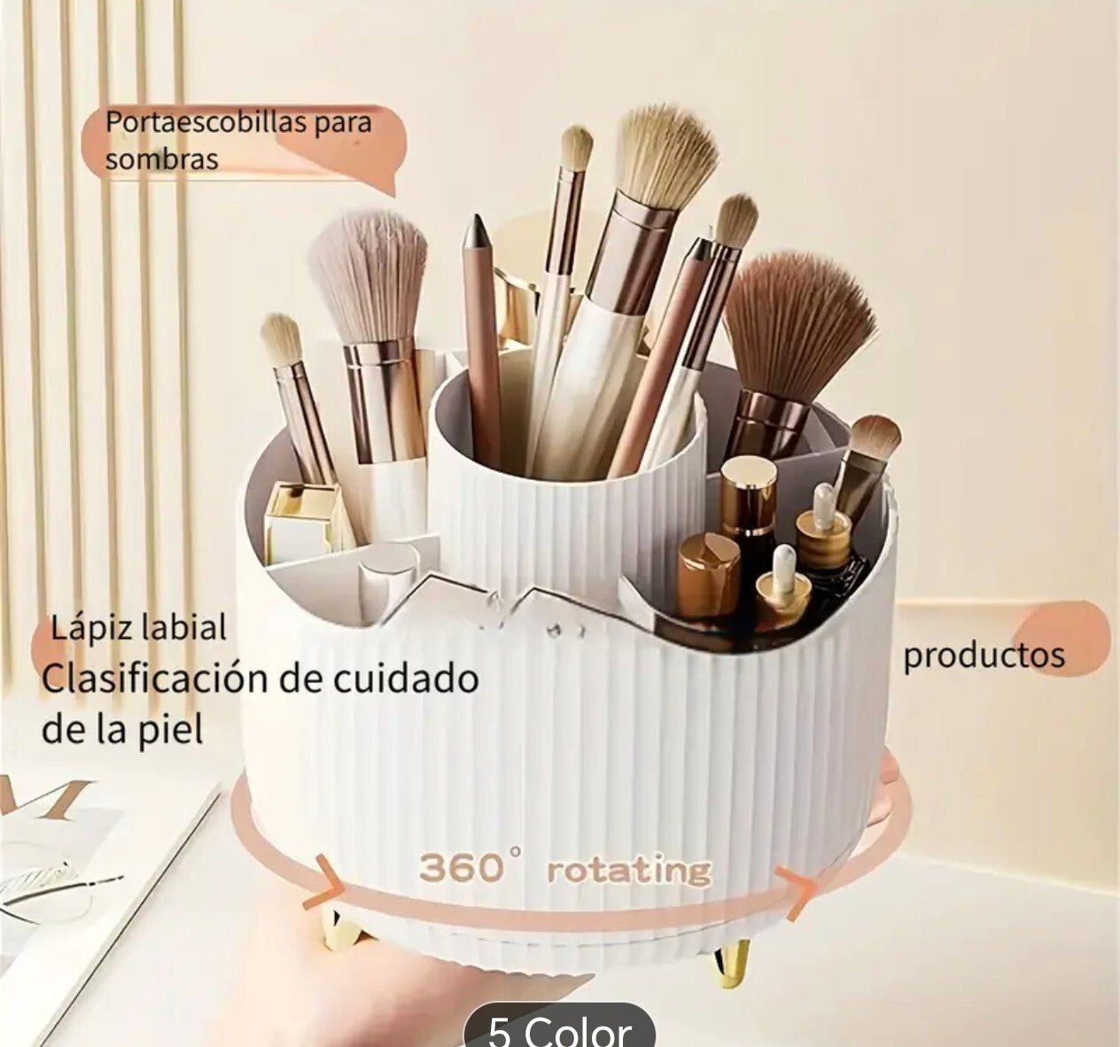 Organizador de Maquillaje Giratorio 360° - 1 Pieza de Almacenamiento de Cosméticos de Plástico con 5 Compartimentos - Soporte Multifuncional para Pinceles, Lápices Labiales, Productos de Cuidado de la Piel y Papelería - Caddy de Escritorio Duradero y Sin Aroma con Diseño de Rayas de Lujo