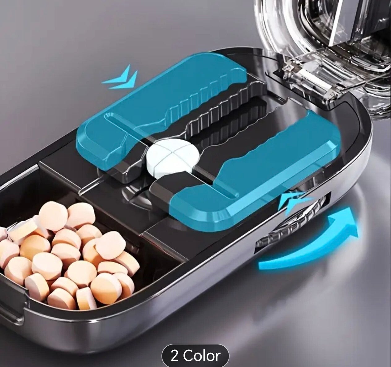 Cortador de pastillas que divide las pastillas en cuatro partes iguales, diseñado para cortar varios tipos de tabletas con alineación precisa, fácil de usar, combina funciones de corte y almacenamiento, tamaño de viaje, adecuado para suplementos de vitaminas y aceite de pescado.